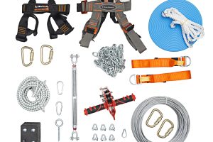 - Harnesses: Two universal with adjustable lanyards, reinforced tie-in point, colour belay loop