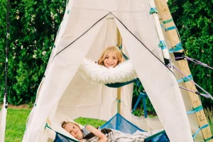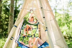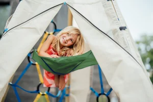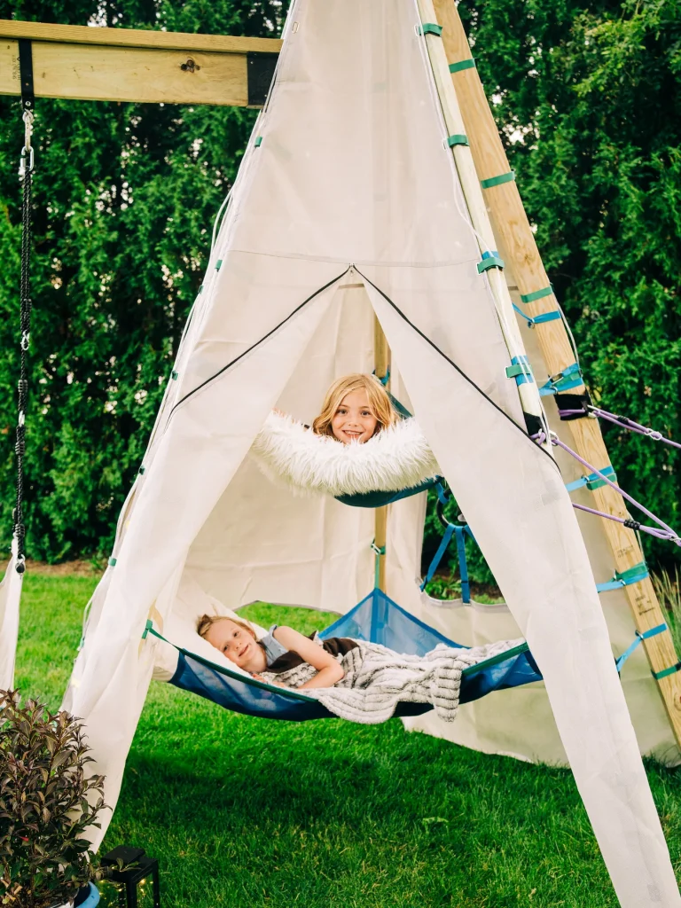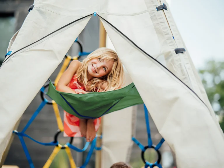 The Next Level offers a bird’s-eye view for friends and siblings to enjoy their Bijou in nature together. Crafted from the same high-quality, UV-resistant outdoor materials as our acclaimed Bijou panels, the Next Level ensures durability against the elements, making it perfect for year-round outdoor use. The material remains permeable, so everything stays dry and ready for the next playtime.