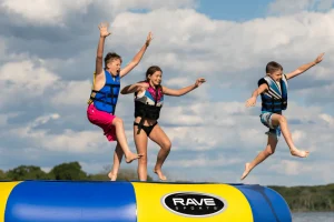 The RAVE Aqua Jump Eclipse is a premium water trampoline with more bounce, faster setup, and no heavy steel frame. Available in two sizes, it’s built for all-day lake fun and can connect to other RAVE water park accessories.