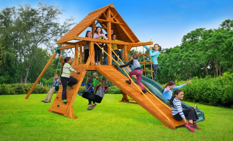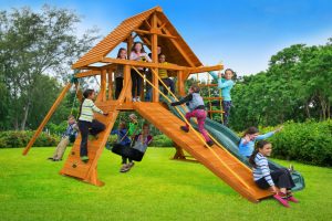 To install the Supremescape 2, you’ll need the base swing set model, wood roof, and 5 ft gang plank. Works best on level or gently sloped ground.