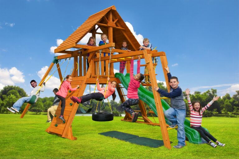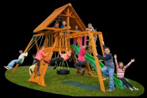 To install the Supremescape 3, you’ll need the base swing set model, wood roof, 5 ft monkey bars, and accessory arm. Set requires fairly level ground but allows for a slight slope.