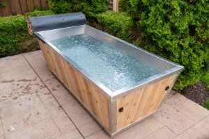 The Polar Plunge Tub is a Canadian-made cold therapy tub with your choice of 304 stainless steel or white HDPE plastic interior and a white cedar exterior. Holding 190 gallons (720 litres), it features angled sides for easy access, an optional roll-up cover, and a drain that connects to any garden hose.