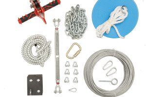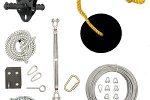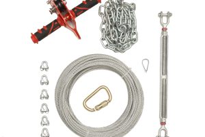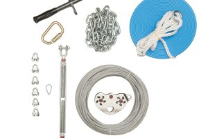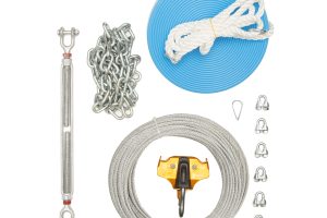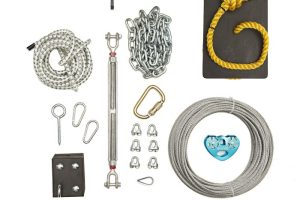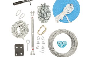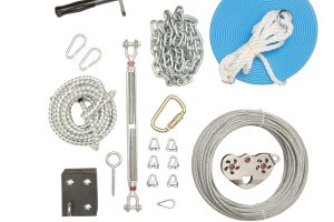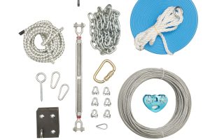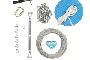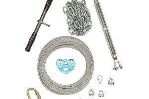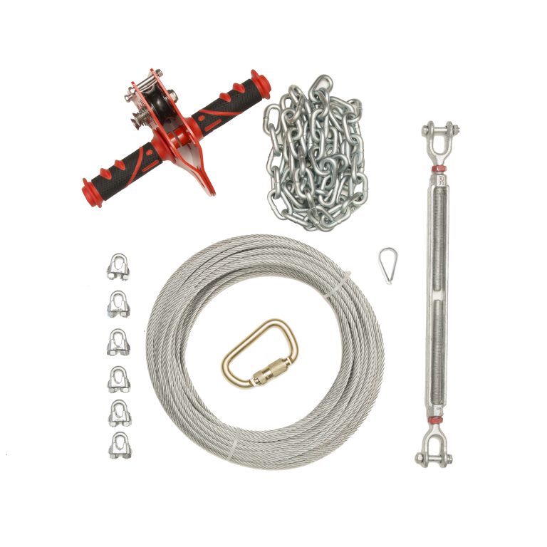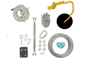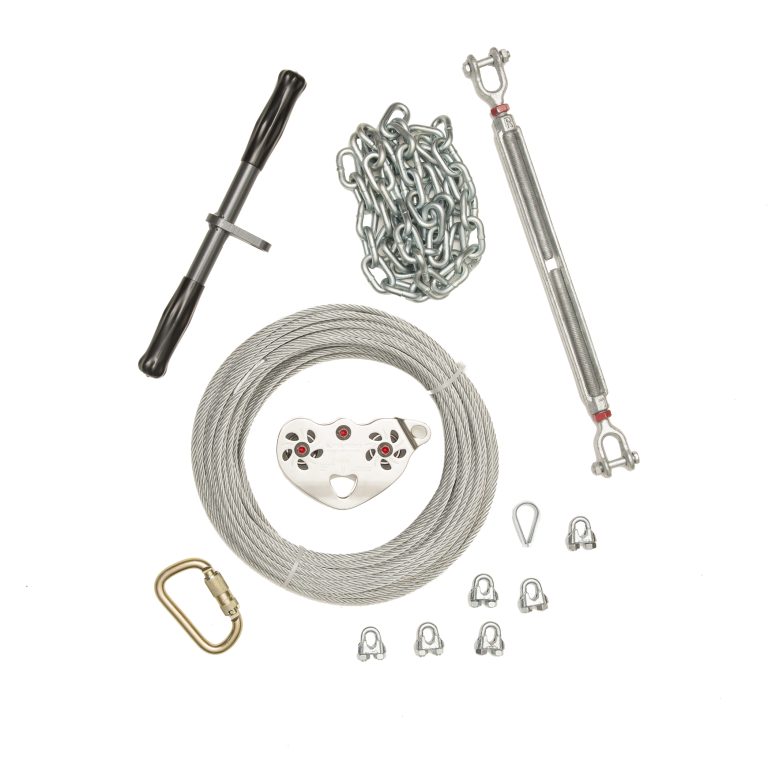 - Hardware: Cable, 6 wire rope clips, 1 thimble, 6 ft chain/sling