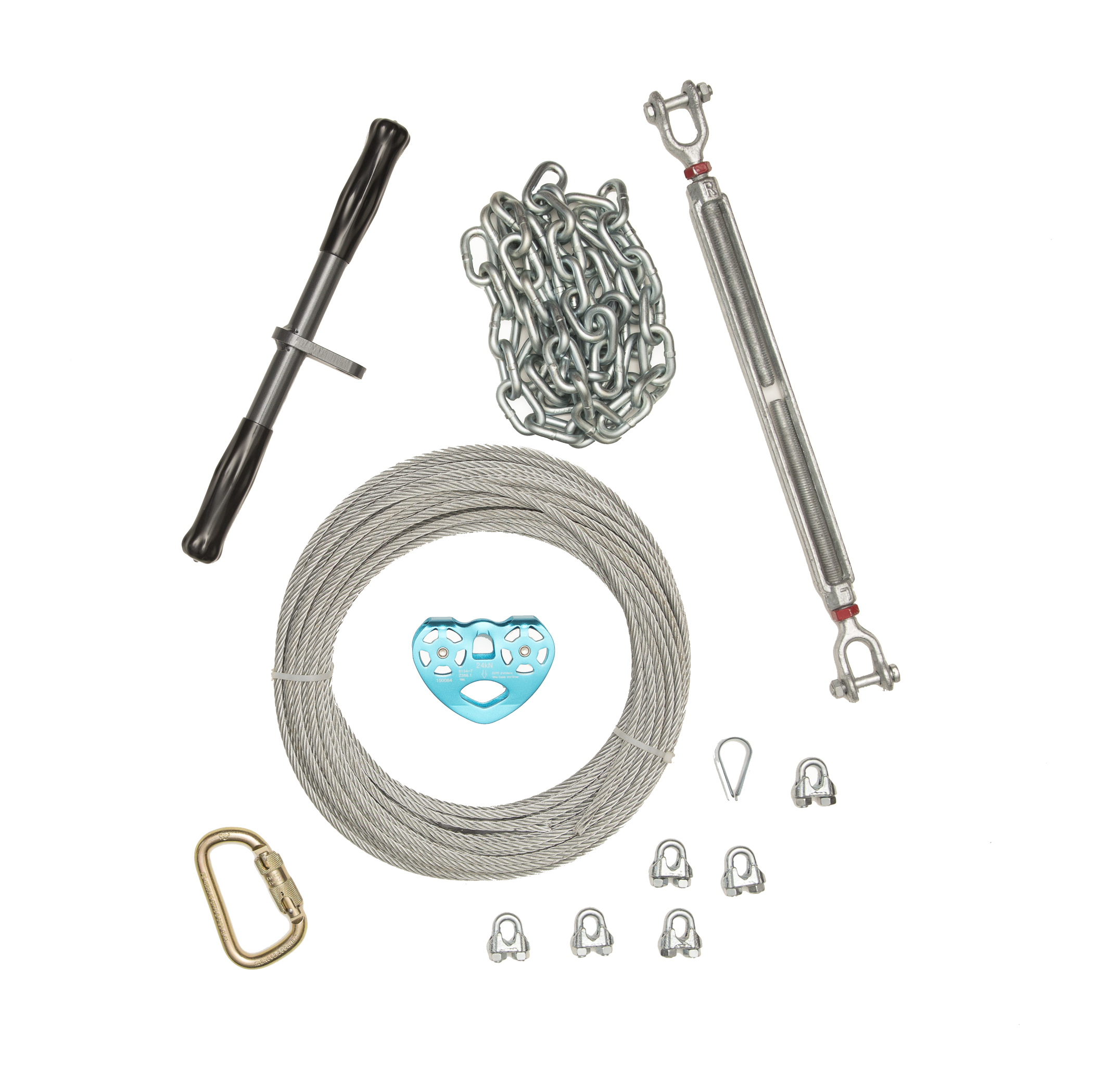 - Hardware: Cable, 6 wire rope clips, 1 thimble, 6 ft chain/sling