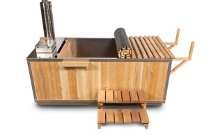Place the tub on a solid, level base. Install the drain hardware and chimney, then fill with water before lighting the wood heater. The tub heats to bathing temperature in less than 3 hours. Optional roll-up cover and steps can be added.
