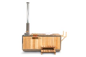 The Starlight Wood Burning Hot Tub holds 233 gallons (885 litres) and features a 5052 aluminium liner with an internal wood stove. Surrounded by white cedar with red cedar backrests and floor, it heats in under 3 hours for a relaxing soak. Optional roll-up cover and steps are available.
